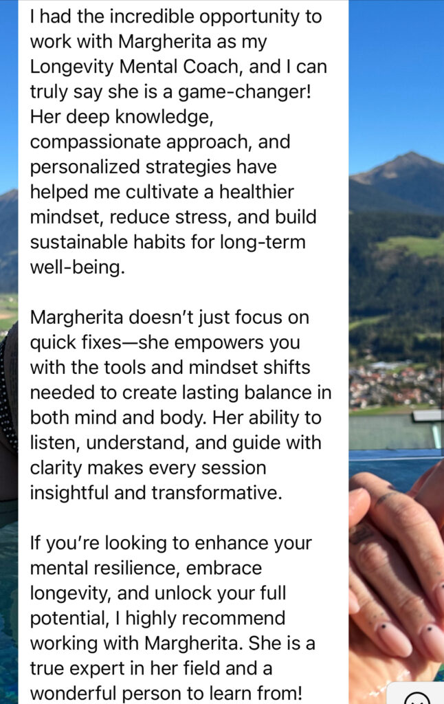 Queste esperienze mi hanno spinta a cercare risposte, a studiare, a crescere e, infine, a diventare una Longevity & Mental Coach. Oggi, aiuto imprenditori, professionisti e sportivi a superare blocchi emotivi e a raggiungere alte performance, proprio come ho fatto io.